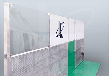 Die L-Stücke werden während des Aufbaus zwischen die Grundelemente montiert, und die Sichtschutzplatten an die dafür vorgesehen Laschen der L-Stücke geschraubt. Der Sichtschutz für Panic Gates wird vormontiert geliefert.